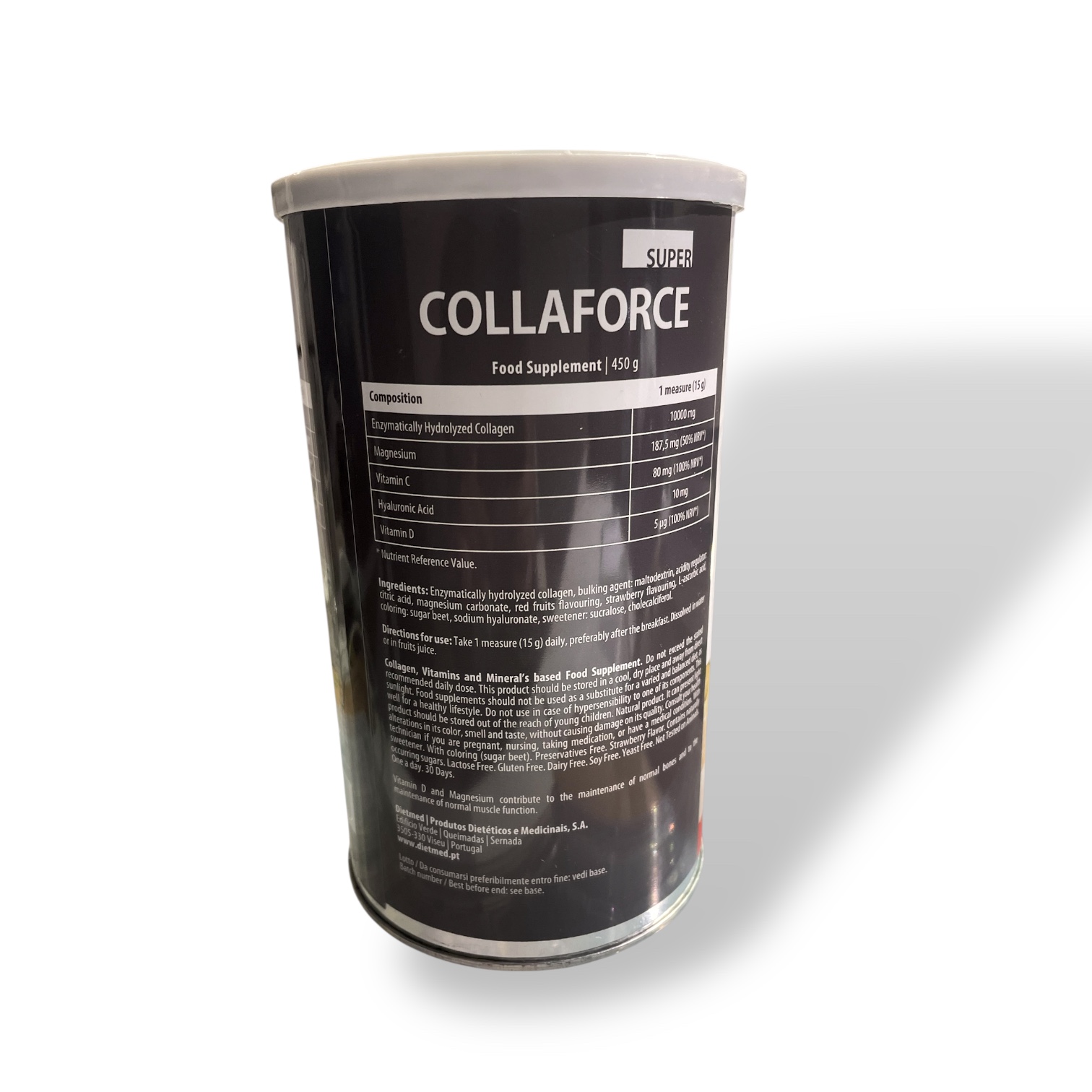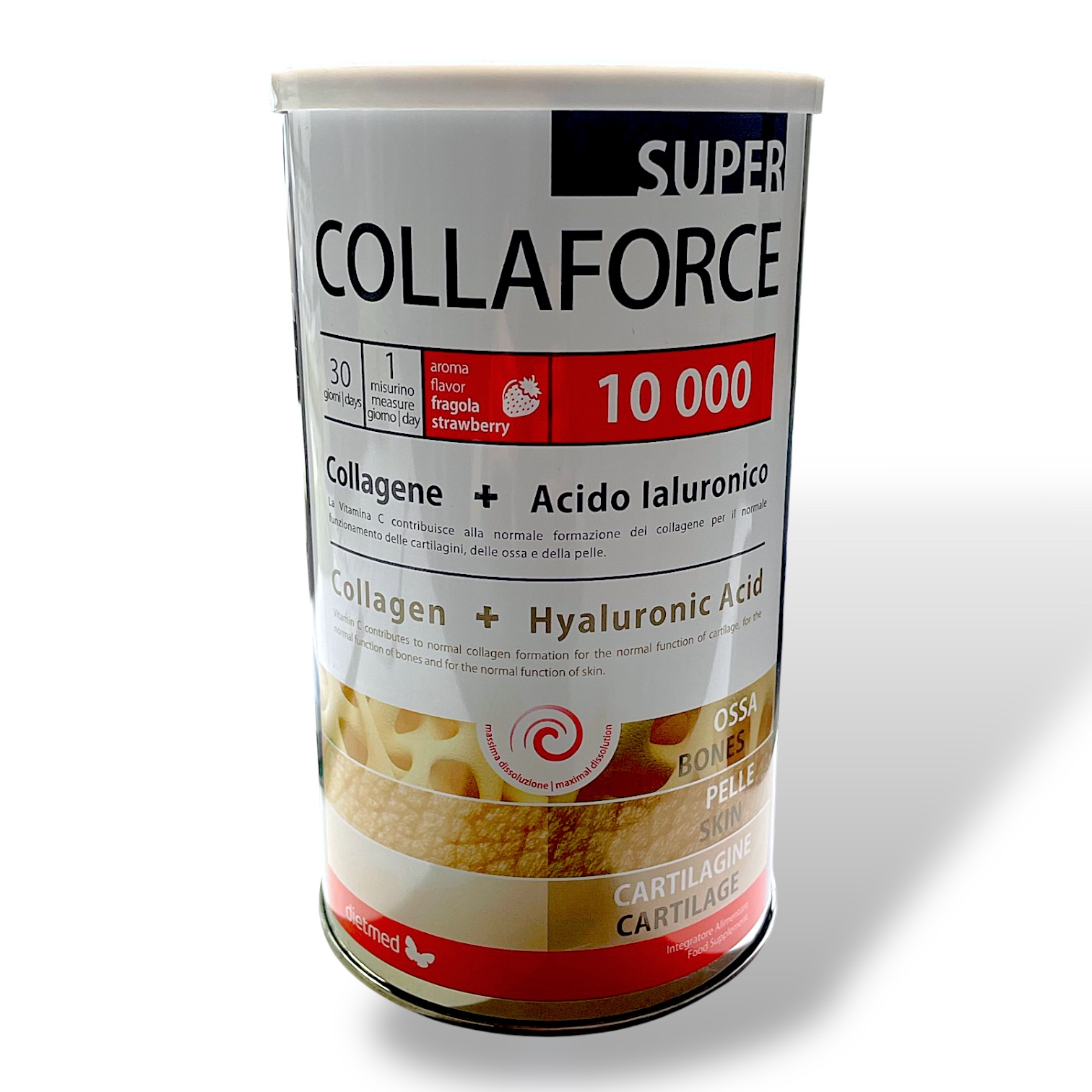 Super Collaforce 10.000 Fragola è un integratore alimentare in polvere a base di collagene idrolizzato enzimaticamente (10.000 mg per dose) arricchito con acido ialuronico, vitamina C, magnesio e vitamina D. La sua formula contribuisce alla normale formazione del collagene e supporta il benessere di ossa, cartilagini, pelle e funzione muscolare. Con gradevole gusto fragola, è facile da assumere sciolto in acqua o succo. Confezione da 450 g – 30 dosi.