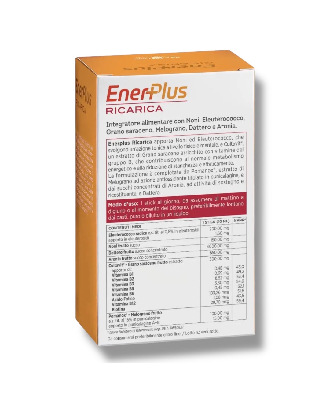 Integratore Alimentare a base di Noni, Eleuterococco, Melograno, Aronia e Dattero e Cultavit®, un estratto di Grano Saraceno arricchito con vitamine del gruppo B. Sostiene energia e vitalità, contrasta stanchezza e affaticamento, favorendo equilibrio fisico e mentale.