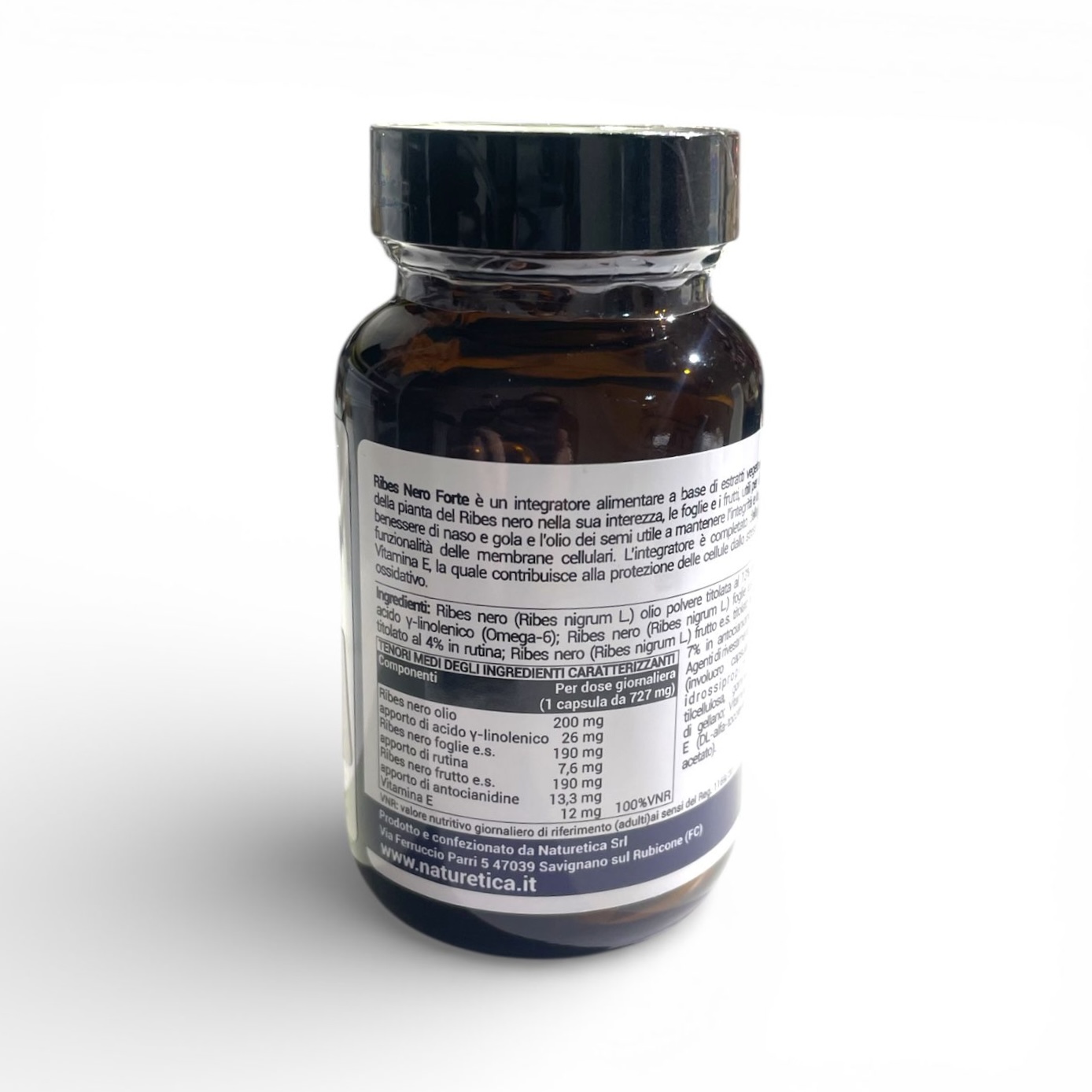 ribes nero (Ribes nigrum L.) Olio polvere titolata al 13% in acido γ-linolenico (omega-6); ribes nero (Ribes nigrum L.) foglie e.s. titolato al 4% in rutina; ribes nero (Ribes nigrum L.) frutto e.s. titolato al 7% in antocianidine; agenti di rivestimento (involucro capsula): idrossipropilmetilcellulosa, gomma di gellano; vitamina E (acetato di D-alfatocoferile).