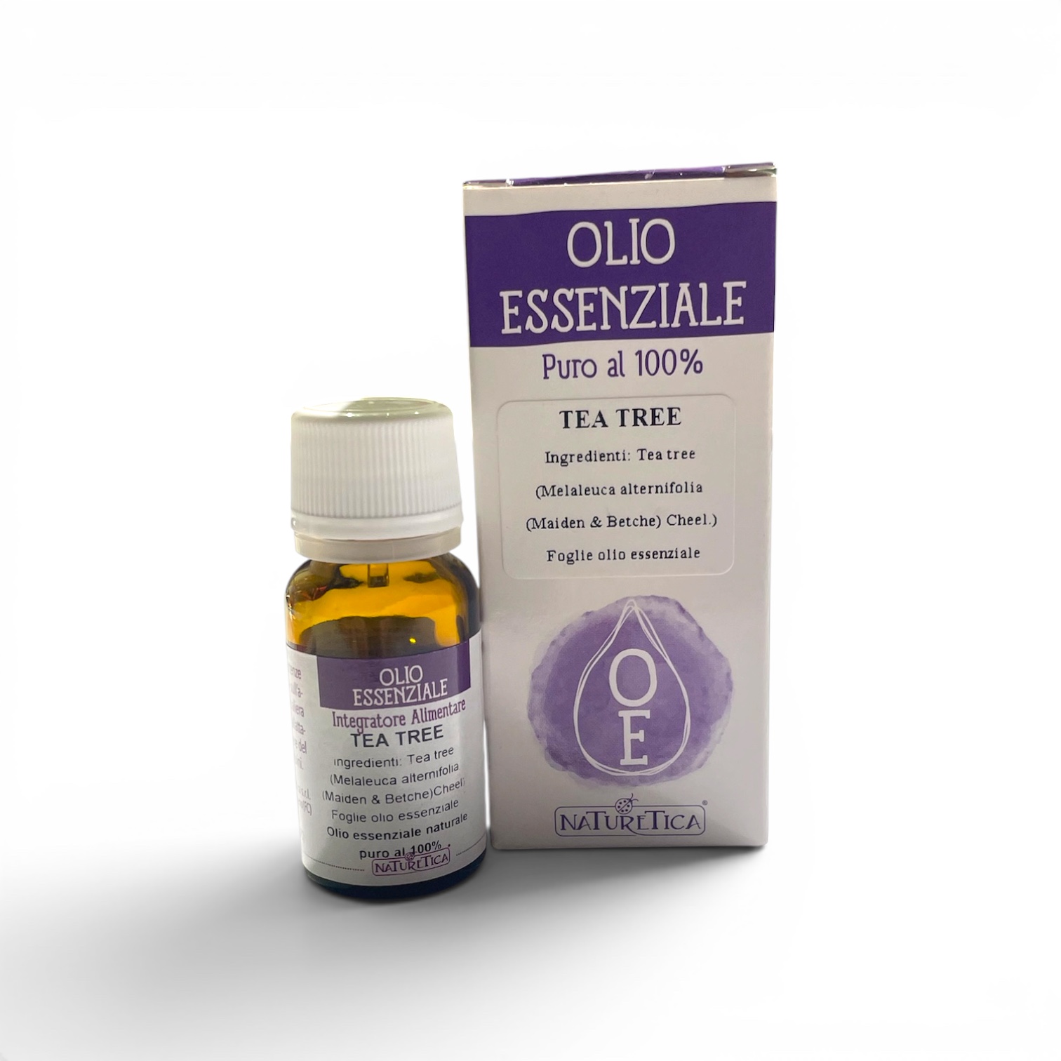 Olio Essenziale di Tea Tree 100% puro e naturale, ottenuto per distillazione a vapore dalle foglie di Melaleuca alternifolia. Utilizzabile come integratore alimentare e per aromaterapia, è apprezzato per le sue proprietà purificanti. Flacone da 10 ml.
